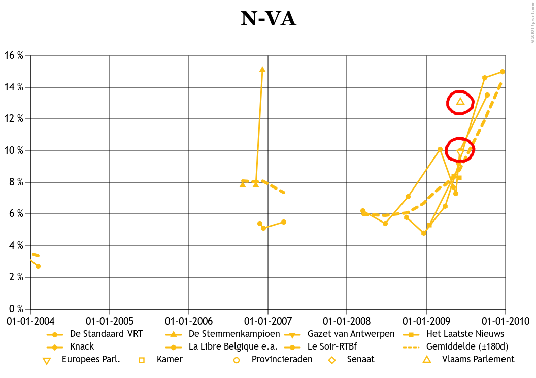 Het gevaar bestaat namelijk dat de media op dit moment de N-VA voor 2011 een overwinningsnederlaag aan het aanpraten zijn. Kijk naar wat Lijst Dedecker overkwam, zoals TNS/Dimarso ook terecht opmerkt: de partij ging er ruim een procent op vooruit, maar zat psychologisch bij de verliezers. Zeker, Bart de Wever was dan misschien wel de bijna-Slimste Mens, maar het was nog lang niet zeker dat zijn partij wel de kiesdrempel zou halen. Ondertussen werden de uitspraken van Jean-Marie Dedecker over wie hij wel en wie hij niet in de Vlaamse regering zou dulden door de verzamelde media zeer ernstig genomen. Met een potentieel van dertig procent dreigt de N-VA de volgende keer precies hetzelfde te overkomen.