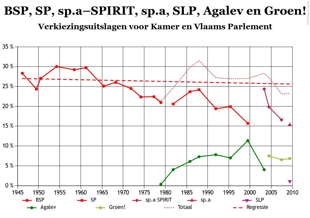 Vlak na de Tweede Wereldoorlog stemde iets meer dan een kwart van de Vlamingen BSP. Vandaag stemt nog minder dan één Vlaming op zes op de verre opvolger de sp.a. Dat is een duidelijke achteruitgang, en de socialistische partij staat dan ook op een historisch laagtepunt. Als we echter abstractie maken van de communistische partij van toen en klein-links van vandaag, dan is het grote verschil tussen nu en de eerste jaren na de Tweede Wereldoorlog vooral dat de BSP toen het monopolie had op de linkse kiezer, terwijl dat voor de sp.a vandaag helemaal niet meer het geval is. Groen! vertegenwoordigde in 2009 ongeveer een derde van de linkse kiezers in Vlaanderen, en slorpte sindsdien nog SLP op. Of dat laatste ook enige betekenis heeft is natuurlijk hoogst onzeker, maar het reduceert natuurlijk wel de versnippering op links. Tellen we de scores van de drie partijen bij mekaar op, komen we nog steeds een eind boven de twintig procent uit. Dat is misschien geen topnotering, zoals uit de figuur van hierboven duidelijk, maar links stond er in de jaren zeventig nog slechter voor in Vlaanderen. Stellen dat links in Vlaanderen vandaag wegsmelt is dus waarschijnlijk voorlopig toch nog iets te kort door de bocht.